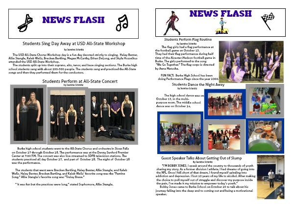 Burke high school students went to the All-State Chorus and orchestra in Sioux Falls on October 27 through October 28. The performance was at the Denny Sanford Premier Center at 7:00 P.M. The concert was also live streamed to SDPB television stations. The students practiced all day October 27, and part of October 28. The night of October 28 was the performance.