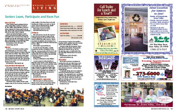 Congregate dining and home delivered meals are provided through a nutrition program. The organization also coordinates activities such as blood pressure checks, arts and crafts, library assistance, health and wellness seminars, and exercise programs like yoga and Tai Chi. Information:( 530) 550-7600. sierraseniors. org