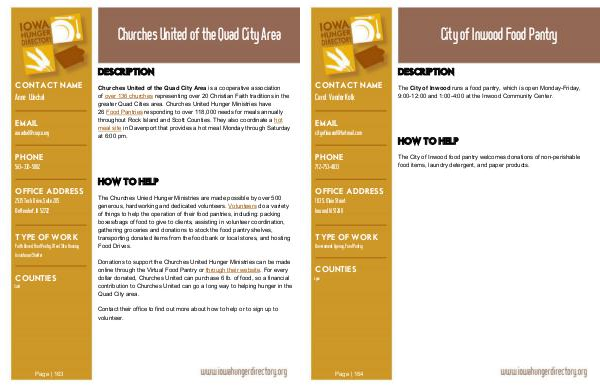 The City of Inwood runs a food pantry, which is open Monday-Friday, 9:00-12:00 and 1:00-4:00 at the Inwood Community Center.
