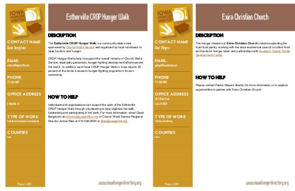 Individuals and organizations can support the work of the Estherville CROP Hunger Walk through volunteering to help organize the walk, fundraising and participating in the walk. For more information, email David Bergstrom at elchurch @ questoffice. net or Church World Service Regional Director Jordan Bles at 410-596-2664 or jbles @ cwsglobal. org.