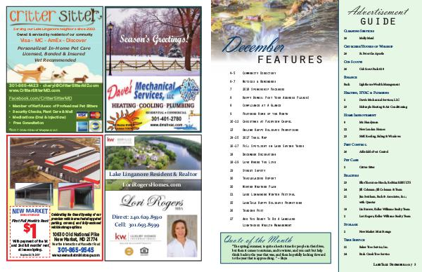 18 December Decorating 18-19 Love Where You Live 19 Street Safety 20 Trailblazers Report 20 Winter Weather Plan 21 Lake Linganore Winter Festival 25 LakeTalk Happy Holidays Promotions 26 Trading Post 27 Are You Ready To Be A Landlord