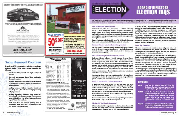 This year’ s Election is a time to make your presence felt and your voice heard. Accomplish both by eVoting, or voting in person on May 6th. Learn about the issues facing Lake Linganore and get involved with a committee that advises the Board. Committees like Strategic Planning, Municipal Incorporation and the Finance Committee are research components of the Board of Directors. Without committees, LLA’ s capacity to grow and improve would be largely diminished.