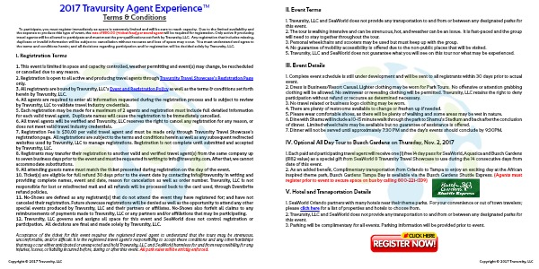 Acceptance of the ticket for this event requires the registered travel agent to understand that the tours may be strenuous, uncomfortable, and/or difficult. It is the registered travel agent’s responsibility to accept these conditions and any other hardships that may occur either anticipated or unexpected and hold Travursity, LLC and SeaWorld harmless for and from responsibility for any injuries, losses, or liability incurred before, during or after this event. All park rules will be strictly enforced.