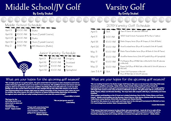 "We set high goals for our golf program. The girls ended their last season as state champions and look to achieve that goal again this season as we have 3 core returnees. We qualified one boy last season and are going to strive to to improve to get more qualified. Hopefully, this snow will melt soon, so we can start getting out on the course! There are a lot of rules changes that go into effect this season, so we look to start implementing those changes right away by taking advantage of that classroom time, when we can't be outside. Like every season, we hope to improve our game fundamentally, physically, and mentally throughout each meet! We are really looking forward to see what this season brings!"