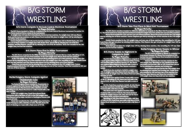 The B/G Storm competed in the Miller Tournament January 5, and won first as a team. Wrestling at 113, Kort Schonebaum won one out of two matches. In the 120 weight class, Mason Peck lost two matches.