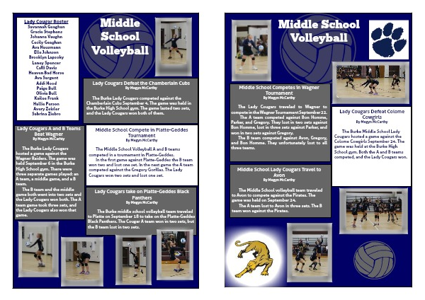 The Burke Middle School Lady Cougars hosted a game against the Colome Cowgirls September 24. The game was held at the Burke High School gym. Both the A and B teams competed, and the Lady Cougars won.