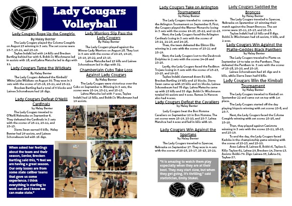 The Lady Cougars traveled to O'Neill Nebraska on September 6. They defeated the Cardinals in 3 sets with the scores of 25-11, 25-11, and 25-13.