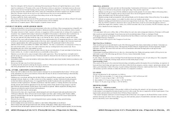 751 500 00(_) SHOWMANSHIP * Showmanship is a demonstration of the member’ s ability to fit and show the animal to its best advantage at halter. Conformation is not judged but the animal must be service- ably sound. The class is required for all show participants. Class requirements and procedures are listed in the 4-H Horse Project materials. * The Grand Champion and Reserve Grand Champion Horse Showman will compete in the Round Robin contest with the members showing each other’ s horse, sheep, hog, goat, beef and dairy projects. Round Robin contestant must provide the horse in which they won in showmanship.