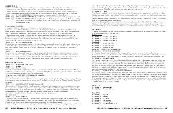 * Equipment and attire requirements will be the same as for Equitation contest. * Horses will be asked to work both ways of the arena at all three gaits to demonstrate their ability with different leads. Riders should keep plenty of space between horses and should stay on the rail, not cutting corners. Horses may be asked to extend gaits, stop and stand quietly and to back easily. Horses will not be asked to reverse at the lope or canter. * Horses should appear to be a“ pleasure to ride” and respond readily and willingly to what is asked. A horse will be penalized for incorrect leads, tail switching, head tossing, opening mouth, excessive speed or slowness at any gait, over flexing or having nose too far out. Should demonstrate easy, comfortable gaits with smooth transitions. Performance 80 %, appointments 20 %( neatness and grooming; overall picture.) 751 700 08(_) WESTERN PLEASURE Horses to be shown in Western equipment at a walk, jog and lope on a reasonably loose rein or light contact without un- due restraint. The judge may request extended gaits. Wrong leads will be penalized and horses considered for an award must back in a straight line. Faults include: breaking gait, open mouth, stumbling or falling, tail switching, sullen or lethargic appearance. 751 700 07(_) ENGLISH PLEASURE Horses to be shown under saddle, not to jump. English equipment with snaffle, Pelham or double bridle, required. Horses should be alert and move obediently and be able to lengthen their stride when asked. Free movement and manners will be emphasized in scoring. Horses to be shown at a walk, trot, and canter both ways to the ring. Horses should back easily and stand quietly. At the discretion of the judge, horses may be asked to hand gallop and then to halt on a loose rein.