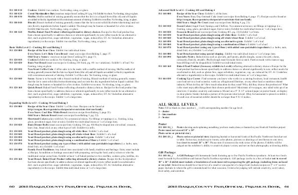 511 130 010 Shortened Cakes( cakes with fat). No commercial mixes; No fillings or toppings( i. e., frosting, icing, glaze, powdered sugar, fruit or nuts). Exhibit two individual items or ¼ of a large item. 511 130 020 Basic Dinner Rolls( must use recipe from Cooking 301, pg. 40) Maybe shaped into cloverleaf, crescent, knot, bun, bread stick or any other type of roll. Exhibit two rolls. 511 130 030 Yeast Bread product, plain dough using all white flour. Exhibit ¼ of a loaf. 511 130 040 Yeast Bread product, plain dough using all whole-wheat flour. Exhibit ¼ of a loaf. 511 130 050 Yeast Bread product, plain dough using an alternative grain. Exhibit ¼ of a loaf. 511 130 060 Yeast Bread product, plain dough using a combination of flours. Exhibit ¼ of a loaf. 511 130 070 Yeast Bread product( using any type of flour) with added non-perishable ingredients( i. e. herbs, nuts, dried fruit, etc.) Exhibit ¼ of a loaf.