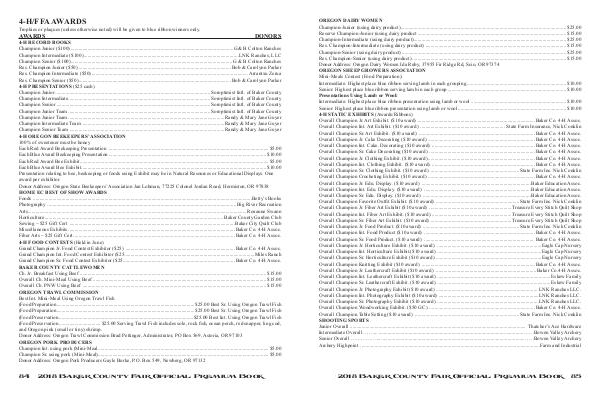 4-H RECORD BOOKS Champion Junior($ 100).............................................................................................................................. G & B Colton Ranches Champion Intermediate($ 100)........................................................................................................................ LNK Ranches, LLC Champion Senior($ 100)............................................................................................................................. G & B Colton Ranches Res. Champion Junior($ 50)...................................................................................................................... Bob & Carolynn Parker Res. Champion Intermediate($ 50)......................................................................................................................... Arrantxu Zerua Res. Champion Senior($ 50)...................................................................................................................... Bob & Carolynn Parker 4-H PRESENTATIONS($ 25 cash) Champion Junior........................................................................................................................ Soroptimist Intl. of Baker County Champion Intermediate.............................................................................................................. Soroptimist Intl. of Baker County Champion Senior....................................................................................................................... Soroptimist Intl. of Baker County Champion Junior Team.............................................................................................................. Soroptimist Intl. of Baker County Champion Junior Team......................................................................................................................... Randy & Mary Jane Guyer Champion Intermediate Team.............................................................................................................. Randy & Mary Jane Guyer Champion Senior Team........................................................................................................................ Randy & Mary Jane Guyer 4-H OREGON BEEKEEPERS’ ASSOCIATION 100 % of sweetener must be honey Each Red Award Beekeeping Presentation............................................................................................................................ $ 5.00 Each Blue Award Beekeeping Presentation.......................................................................................................................... $ 10.00 Each Red Award Bee Exhibit.................................................................................................................................................. $ 5.00 Each Blue Award Bee Exhibit............................................................................................................................................... $ 10.00 Presentation relating to bee, beekeeping or foods using Exhibit may be in Natural Resources or Educational Displays. One award per exhibitor. Donor Address: Oregon State Beekeepers’ Association Jan Lohman, 77225 Colonel Jordan Road, Hermiston, OR 97838 HOME EC BEST OF SHOW AWARDS Foods......................................................................................................................................................................... Betty’ s Books Photography.................................................................................................................................................. Big River Recreation Arts......................................................................................................................................................................... Roxanne Swann Horticulture.......................................................................................................................................... Baker County Garden Club Sewing ~ $ 25 Gift Cert................................................................................................................................ Baker City Quilt Club Miscellaneous Exhibits................................................................................................................................. Baker Co. 4-H Assoc. Fiber Arts ~ $ 25 Gift Cert............................................................................................................................. Baker Co. 4-H Assoc. 4-H FOOD CONTESTS( Held in June) Grand Champion Jr. Food Contest Exhibitor($ 25)..................................................................................... Baker Co. 4-H Assoc. Grand Champion Int. Food Contest Exhibitor($ 25..................................................................................................... Miles Ranch Grand Champion Sr. Food Contest Exhibitor($ 25....................................................................................... Baker Co. 4-H Assoc. BAKER COUNTY CATTLEWOMEN Ch. Jr. Breakfast Using Beef................................................................................................................................................ $ 15.00 Overall Ch. Mini-Meal Using Beef...................................................................................................................................... $ 15.00 Overall Ch. PNW Using Beef.............................................................................................................................................. $ 15.00 OREGON TRAWL COMMISSION Best Int. Mini-Meal Using Oregon Trawl Fish( Food Preparation...........................................................................................................$ 25.00 Best Sr. Using Oregon Trawl Fish( Food Preparation...........................................................................................................$ 25.00 Best Sr. Using Oregon Trawl Fish( Food Preservatio