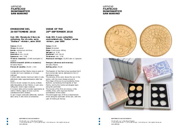 “Zodiaco” «Ariete», anno 2018 Code 301: 5 euro collectible