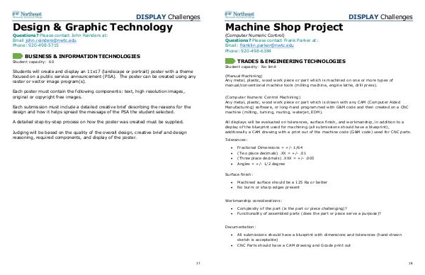 All displays will be evaluated on tolerances, surface finish, and workmanship, in addition to a display of the blueprint used for machining( all submissions should have a blueprint), additionally a CAM drawing with a print out of the machine code( G & M code) used for CNC parts.