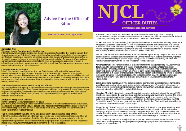 Editor: "An NJCL Editor’s main job is to assemble the Torch: U.S., which is a lot more work than most would think. The editor needs to maintain contact with other state editors to ask for state update submission articles. There is always room to be creative with the Torch: U.S. both content-wise and visually. The editor writes cover stories and other articles and formats all the written content into an aesthetic, organized publication. There are four issues released every year." ~ Anika Park