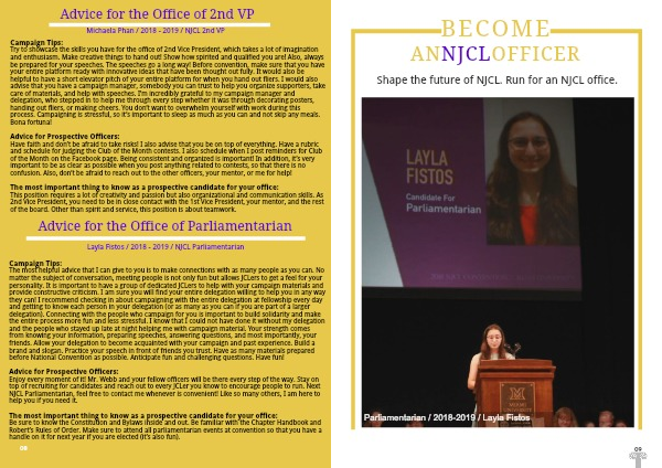 Enjoy every moment of it! Mr. Webb and your fellow officers will be there every step of the way. Stay on top of recruiting for candidates and reach out to every JCLer you know to encourage people to run. Next NJCL Parliamentarian, feel free to contact me whenever is convenient! Like so many others, I am here to help you if you need it.