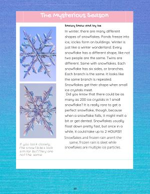 Snowy Snow and Icy Ice In winter , there are many different shapes of snowflakes . Ponds freeze into ice , icicles form on buildings . Winter is just like a winter wonderland . Every snowflake has a different shape , like not two people are the same . Twins are different . Same with snowflakes . Each snowflake has six sides , or branches . Each branch is the same . It looks like the same branch is repeated . Snowflakes get their shape when small ice crystals meet .
