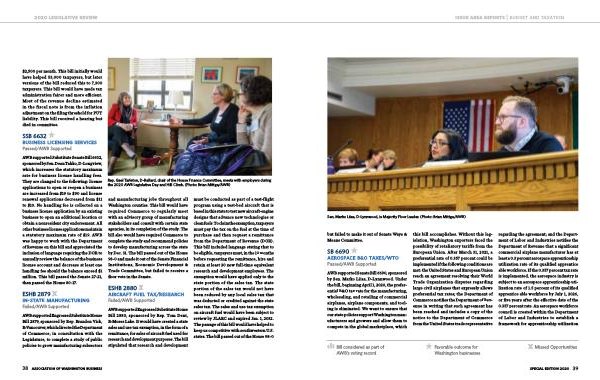 AWB supported Senate Bill 6690 , sponsored by Sen . Marko Liias , D-Lynnwood . Under the bill , beginning April 1 , 2020 , the preferential B & O tax rate for the manufacturing , wholesaling , and retailing of commercial airplanes , airplane components , and tooling is eliminated . We want to ensure that our state policies support Washington manufacturers and growers and allow them to compete in the global marketplace , which this bill accomplishes . Without this legislation , Washington exporters faced the possibility of retaliatory tariffs from the European Union . After March 31 , 2021 , a preferential rate of 0.357 percent could be implemented if the following conditions are met : the United States and European Union reach an agreement resolving their World Trade Organization disputes regarding large civil airplanes that expressly allows preferential tax rates ; the Department of Commerce notifies the Department of Revenue in writing that such agreement has been reached and includes a copy of the notice to the Department of Commerce from the United States trade representative regarding the agreement ; and the Department of Labor and Industries notifies the Department of Revenue that a significant commercial airplane manufacturer has at least a 0.3 percent aerospace apprenticeship utilization rate of its qualified apprentice able workforce . If the 0.357 percent tax rate is implemented , the aerospace industry is subject to an aerospace apprenticeship utilization rate of 1.5 percent of its qualified apprentice able workforce by July 1 , 2026 , or five years after the effective date of the 0.357 percent rate . An aerospace workforce council is created within the Department of Labor and Industries to establish a framework for apprenticeship utilization