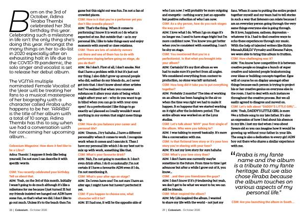 Colossium Magazine : How does it feel like to be a Libra ? Adina Thembi : I suppose it feels like being yourself , I ’ m not sure I can describe it with specific words .