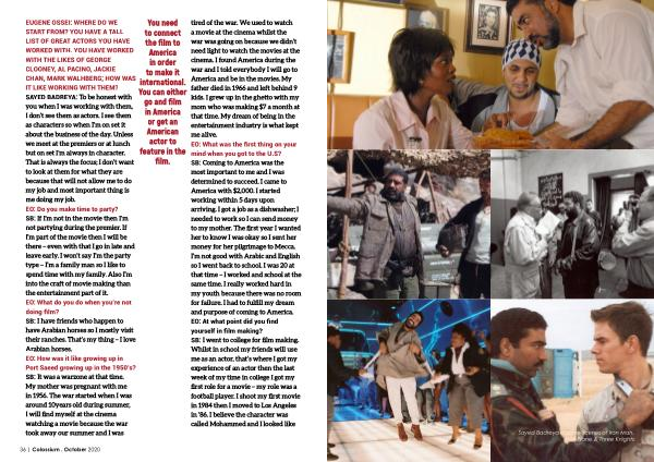 EUGENE OSSEI : WHERE DO WE START FROM ? YOU HAVE A TALL LIST OF GREAT ACTORS YOU HAVE WORKED WITH . YOU HAVE WORKED WITH THE LIKES OF GEORGE CLOONEY , AL PACINO , JACKIE CHAN , MARK WALHBERG ; HOW WAS IT LIKE WORKING WITH THEM ? SAYED BADREYA : To be honest with you when I was working with them , I don ’ t see them as actors . I see them as characters so when I ’ m on set it about the business of the day . Unless we meet at the premiers or at lunch but on set I ’ m always in character . That is always the focus ; I don ’ t want to look at them for what they are because that will not allow me to do my job and most important thing is me doing my job . EO : Do you make time to party ? SB : If I ’ m not in the movie then I ’ m not partying during the premier . If I ’ m part of the movie then I will be there – even with that I go in late and leave early . I won ’ t say I ’ m the party type – I ’ m a family man so I like to spend time with my family . Also I ’ m into the craft of movie making than the entertainment part of it . EO : What do you do when you ’ re not doing film ? SB : I have friends who happen to have Arabian horses so I mostly visit their ranches . That ’ s my thing – I love Arabian horses . EO : How was it like growing up in Port Saeed growing up in the 1950 ’ s ? SB : It was a warzone at that time . My mother was pregnant with me in 1956 . The war started when I was around 10years old during summer , I will find myself at the cinema watching a movie because the war took away our summer and I was