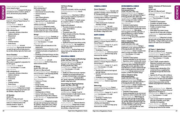 Outdoor Adventures Fall Environmental Science [ AndHS , AHS , BHS , CPHS only ] Prerequisite / Selection Process : Biology I , IB Biology SL or HL , Coll Honors Biology , or AP Biology [ AndHS , BHS , CRHS only ] Intended Audience : Grade 12 students interested in ecology and outdoor activities . Credit : One trimester = 0.5 credit Major Outcomes :