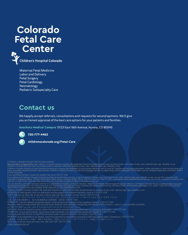 Anschutz Medical Campus 13123 East 16th Avenue , Aurora , CO 80045 720-777-4463 childrenscolorado . org / Fetal-Care