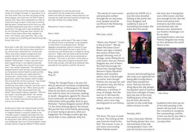 Keira was in awe. Her mom actually fought and won over a virus. She had so many questions -- but one of them interested her in particular. “Mom, why didn’t anyone recognize all the people that didn’t survive and why didn’t anyone recognize the virus and what it did to people?” Keira asked. “I mean, was the virus even a good thing, in the slightest possible way?” “Well, actually the virus did have some pros.” her mother responded. “For example, people became more sanitary, and people spoke up more about mental health as well as other issues. But to answer your other question, I actually don’t really know. I think you made a great point, about how people never brought the virus and the victims to justice.” she smiled sadly, and Keira knew that she had to do something. She knew it wouldn’t be much, but it would be enough for her. “Mom, thank you for telling me this. May I be excused from the table?” Keira asked, slightly impatient. “Wh-but you haven’t touched your food!” her mother said. “I’m not hungry.” “.....fine, but just this time.” her mother said hesitantly. Keira smiled and ran up to her room.