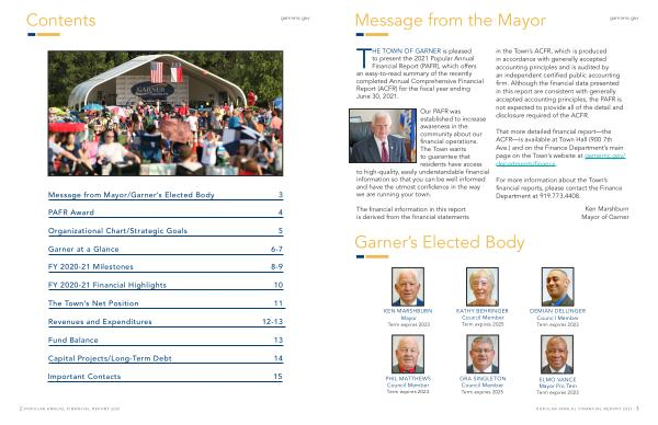 THE TOWN OF GARNER is pleased to present the 2021 Popular Annual Financial Report ( PAFR ), which offers an easy-to-read summary of the recently completed Annual Comprehensive Financial Report ( ACFR ) for the fiscal year ending June 30 , 2021 .