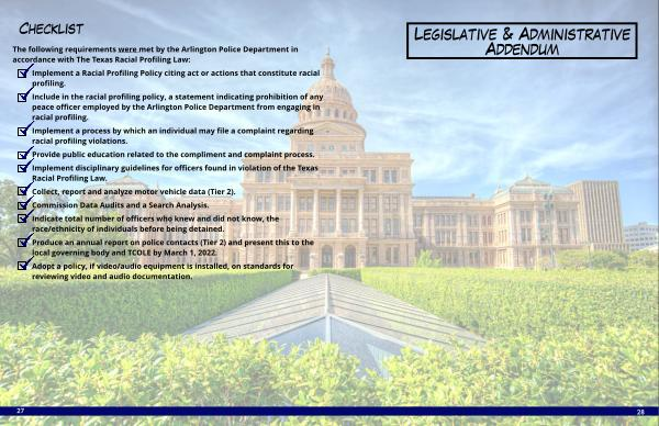 The follow ing requirem ent s w ere m et by t he Arlingt on Police Depart m ent in accordance w it h The Texas Racial Profiling Law :