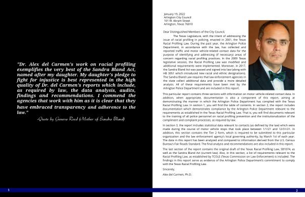 The last section of the report contains the original draft of the Texas Racial Profiling Law , SB1074 , as well as the Sandra Bland Act ( current law ). Also , in this section , a list of requirements relevant to the Racial Profiling Law , as established by TCOLE ( Texas Commission on Law Enforcement ) is included . The findings in this report serve as evidence of the Arlington Police Department ? s commitment to comply with the Texas Racial Profiling Law .