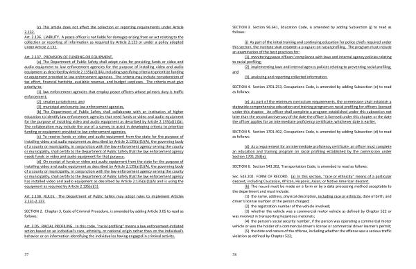 2.132 . Art . 2.136 . LIABILITY . A peace officer is not liable for damages arising from an act relating to the collection or reporting of information as required by Article 2.133 or under a policy adopted under Article 2.132 .