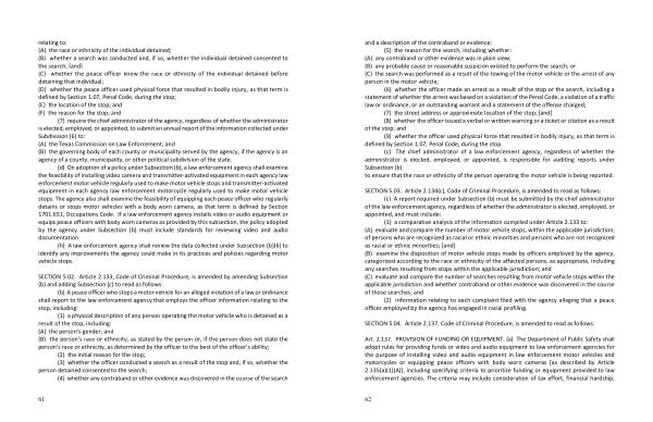 ( 1 ) a comparative analysis of the information compiled under Article 2.133 to : ( A ) evaluate and compare the number of motor vehicle stops , within the applicable jurisdiction , of persons who are recognized as racial or ethnic minorities and persons who are not recognized as racial or ethnic minorities ; [ and ] ( B ) examine the disposition of motor vehicle stops made by officers employed by the agency , categorized according to the race or ethnicity of the affected persons , as appropriate , including any searches resulting from stops within the applicable jurisdiction ; and ( C ) evaluate and compare the number of searches resulting from motor vehicle stops within the applicable jurisdiction and whether contraband or other evidence was discovered in the course of those searches ; and