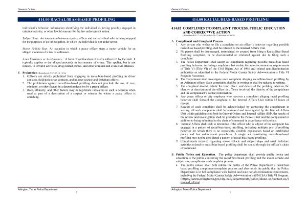 • The public notice , shall both inform the public of the Police Department ’ s racial / bias based profiling compliment / complaint process and also notify the public that the Police Department is in full compliance with federal and state non-discrimination requirements , including the Federal Motor Carrier Safety Administration ’ s ( FMCSA ) Title VI Program . ( https :// www . arlingtontx . gov / city _ hall / departments / police / about _ us / contact _ us / i nternal _ affairs )