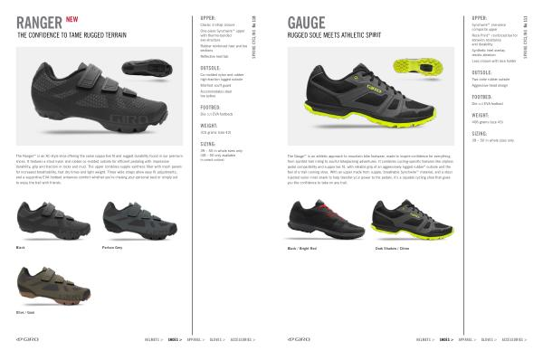 The Gauge™ is an athletic approach to mountain bike footwear , made to inspire confidence for everything from spirited trail riding to soulful bikepacking adventures . It combines cycling-specific features like clipless pedal compatibility and supportive fit , with reliable grip of an aggressively lugged rubber ® outsole and the feel of a trail running shoe . With an upper made from supple , breathable Synchwire™ material , and a stout injected nylon inner shank to help transfer your power to the pedals , it ’ s a capable cycling shoe that gives you the confidence to take on any trail .