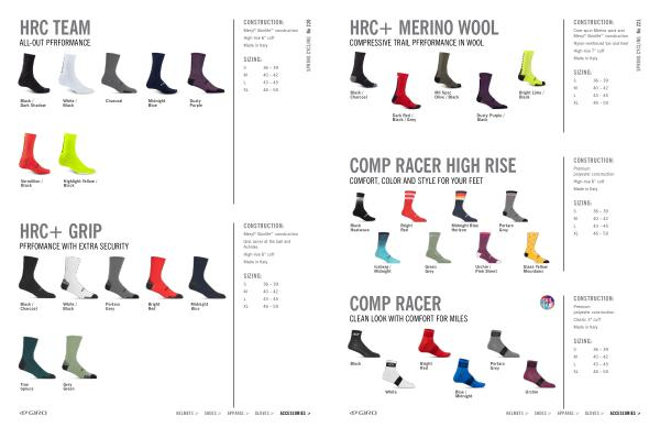 SPRING CYCLING No 220 HELMETS > SHOES > APPAREL > GLOVES > ACCESSORIES > HRC TEAM ALL-OUT PERFORMANCE HRC + GRIP PERFOMANCE WITH EXTRA SECURITY CONSTRUCTION : Meryl ® Skinlife™ construction High-rise 6 ” cuff Made in Italy SIZING : S 36 – 39 M 40 – 42 L 43 – 45 XL 46 – 50 PRICE : $ 20 USD CONSTRUCTION : Meryl ® Skinlife™ construction Grip zones at the ball and Achilles High-rise 6 ” cuff Made in Italy SIZING : S 36 – 39 M 40 – 42 L 43 – 45 XL 46 – 50 PRICE : $ 25 USD Black / Dark Shadow S-XL 7068787-0 Black / Charcoal S-XL 7111962-5 Dusty Purple S-XL 7099330-3 True Spruce S-XL 7111978-1 Grey Green S-XL 7128071-4 White / Black S-XL 7059212-5 White / Black S-XL 7111982-5 Charcoal S-XL 7111958-1 Bright Red S-XL 7111966-9 Vermillion / Black S-XL 7077496-9 Midnight Blue S-XL 7085819-2 Midnight Blue S-XL 7111970-3 Highlight Yellow / Black S-XL 7059208-1 Portaro Grey S-XL 7128075-8