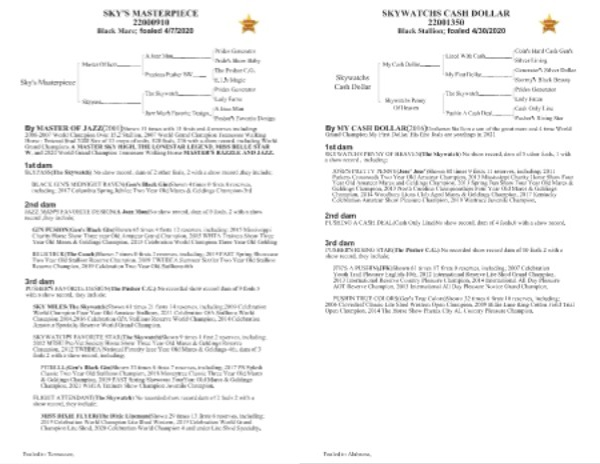 By MASTER OF JAZZ ( 2001 ) Shown 31 times with 15 firsts and 4 reserves including : 2006-2007 World Champion Over 15.2 Stallion , 2007 World Grand Champion Tennessee Walking Horse ; Entered Stud 2008 Sire of 13 crops of colts , 528 foals , 236 with a show record , including World Grand Champions A MASTER SKY HIGH , THE LONESTAR LEGEND , MISS BELLE STAR W , and 2020 World Grand Champion Tennessee Walking Horse MASTER ' S RAZZLE AND JAZZ .