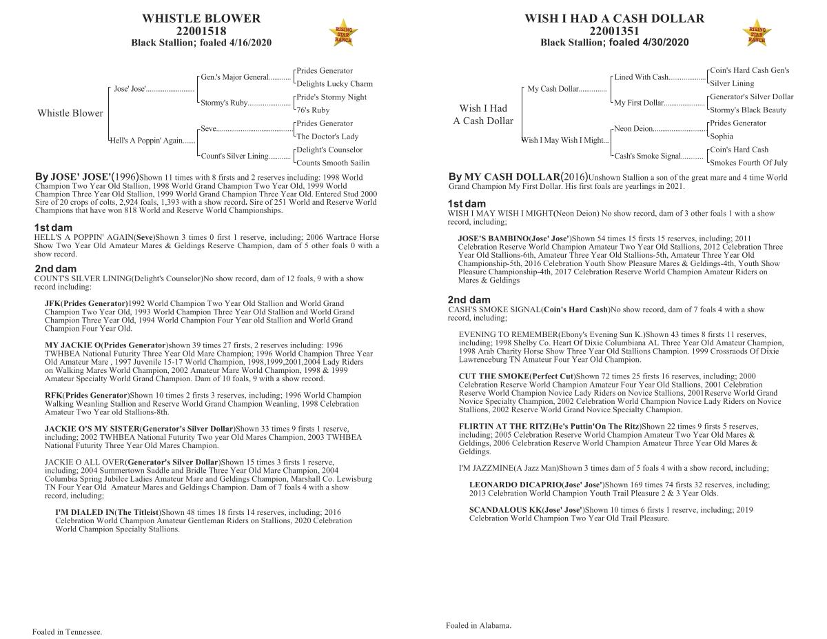 By JOSE ' JOSE '( 1996 ) Shown 11 times with 8 firsts and 2 reserves including : 1998 World Champion Two Year Old Stallion , 1998 World Grand Champion Two Year Old , 1999 World Champion Three Year Old Stallion , 1999 World Grand Champion Three Year Old . Entered Stud 2000 Sire of 20 crops of colts , 2,924 foals , 1,393 with a show record . Sire of 251 World and Reserve World Champions that have won 818 World and Reserve World Championships .