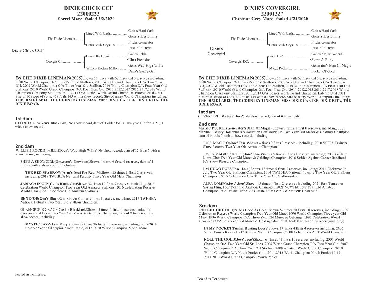 By THE DIXIE LINEMAN ( 2005 ) Shown 75 times with 68 firsts and 5 reserves including : 2008 World Champion O / A Two Year Old Stallions , 2008 World Grand Champion O / A Two Year Old , 2009 World Champion O / A Three Year Old Stallion , 2010 World Champion O / A Four Year Old Stallions , 2010 World Grand Champion O / A Four Year Old , 2011,2012,2013,2015,2017,2018 World Champion O / A Pony Stallions , 2011,2013 O / A Ponies World Grand Champion . Entered Stud 2011 Sire of 10 crops of colts , 439 foals , 145 with a show record . Sire of many World Champions including ; THE DIXIE LABEL , THE COUNTRY LINEMAN , MISS DIXIE CARTER , DIXIE RITA , THE DIXIE ROAD .