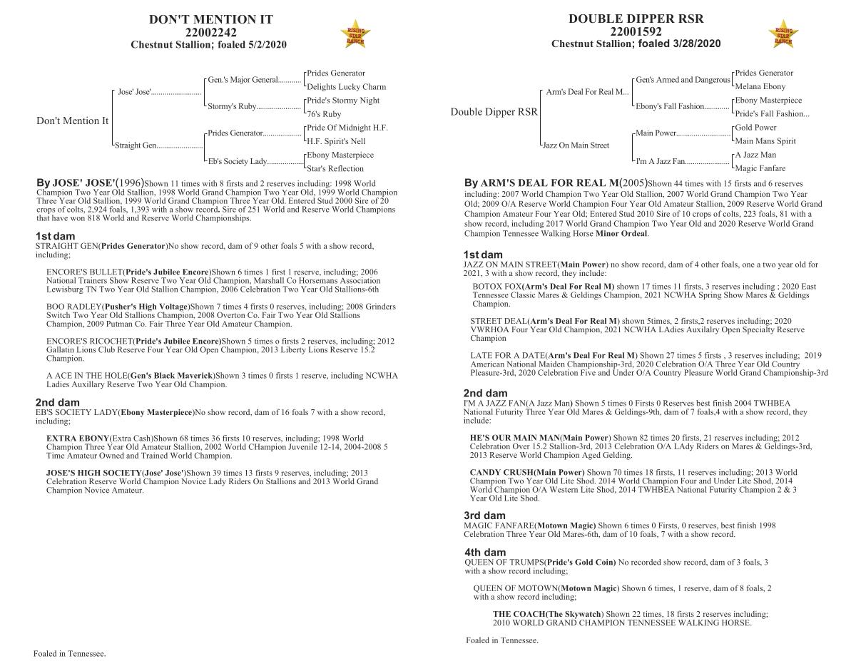 By ARM ' S DEAL FOR REAL M ( 2005 ) Shown 44 times with 15 firsts and 6 reserves including : 2007 World Champion Two Year Old Stallion , 2007 World Grand Champion Two Year Old ; 2009 O / A Reserve World Champion Four Year Old Amateur Stallion , 2009 Reserve World Grand Champion Amateur Four Year Old ; Entered Stud 2010 Sire of 10 crops of colts , 223 foals , 81 with a show record , including 2017 World Grand Champion Two Year Old and 2020 Reserve World Grand Champion Tennessee Walking Horse Minor Ordeal .
