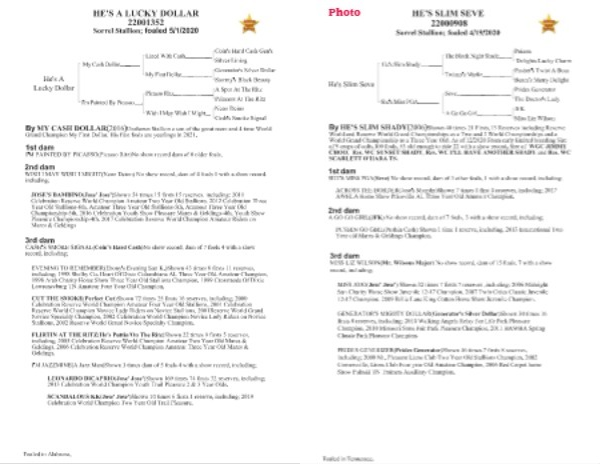 By MY CASH DOLLAR ( 2016 ) Unshown Stallion a son of the great mare and 4 time World Grand Champion My First Dollar . His first foals are yearlings in 2021 .