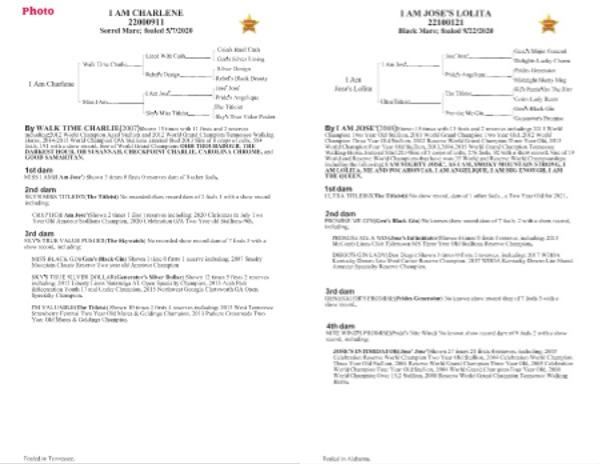 By WALK TIME CHARLIE ( 2007 ) Shown 15 times with 11 firsts and 2 reserves including : 2012 World Champion Aged Stallion and 2012 World Grand Champion Tennessee Walking Horse , 2014-2015 World Champion O / A Stallions Entered Stud 2013 Sire of 8 crops of colts , 584 foals , 191 with a show record . Sire of World Grand Champions OHH TROUBADOUR , THE DARKEST HOUR , OH SUSANNAH , CHECKPOINT CHARLIE , CAROLINA CHROME , and GOOD SAMARITAN .