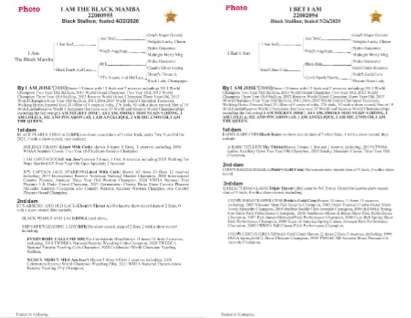 BLACK PEARLS AND LACE ( RFK ) no show record dam of 5 other foals , and a Two Year Old for 2021 , 3 with a show record , they include :