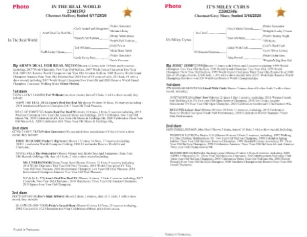 By ARM ' S DEAL FOR REAL M ( 2005 ) Shown 44 times with 15 firsts and 6 reserves including : 2007 World Champion Two Year Old Stallion , 2007 World Grand Champion Two Year Old ; 2009 O / A Reserve World Champion Four Year Old Amateur Stallion , 2009 Reserve World Grand Champion Amateur Four Year Old ; Entered Stud 2010 Sire of 10 crops of colts , 223 foals , 81 with a show record , including 2017 World Grand Champion Two Year Old and 2020 Reserve World Grand Champion Tennessee Walking Horse Minor Ordeal .