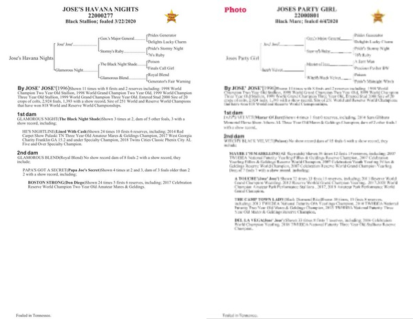 DEL LA VEGA ( Jose ' Jose ') Shown 33 times 8 firsts 7 reserves , including ; 2016 Celebration World Champion Yearling , 2018 TWHBEA National Futurity Three Year Old Stallions Reserve Champion .