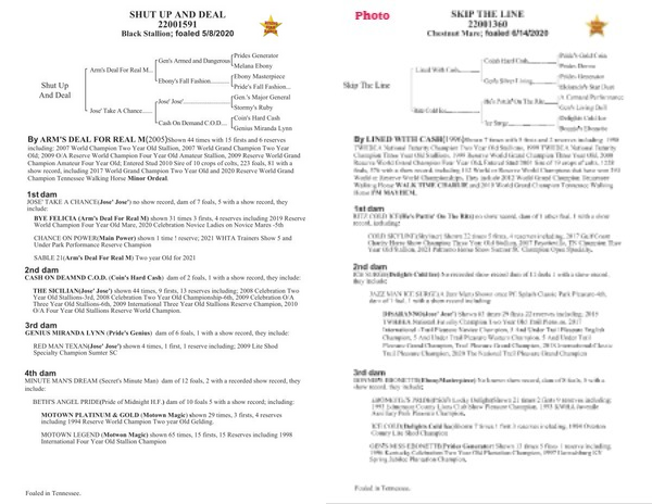 By LINED WITH CASH ( 1996 ) Shown 7 times with 5 firsts and 2 reserves including : 1998 TWHBEA National Futurity Champion Two Year Old Stallions , 1999 TWHBEA National Futurity Champion Three Year Old Stallions , 1999 Reserve World Grand Champion Three Year Old , 2000 Reserve World Grand Champion Four Year Old . Entered Stud 2001 Sire of 19 crops of colts , 1228 foals , 576 with a show record , including 112 World or Reserve World Champions that have won 393 World or Reserve World Championships . They include 2012 World Grand Champion Tennessee Walking Horse WALK TIME CHARLIE and 2019 World Grand Champion Tennessee Walking Horse I ' M MAYHEM .