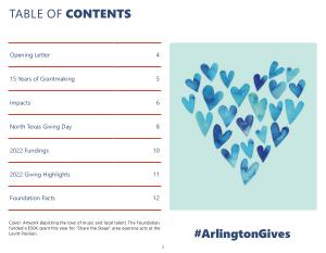 Cover : Artwork depicting the love of music and local talent . The Foundation funded a $ 50K grant this year for “ Share the Stage ” area opening acts at the Levitt Pavilion .