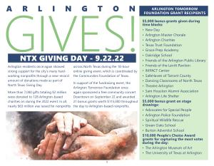 More than 7,000 gifts totaling $ 2 million were donated to 128 Arlington-based charities on during the 2022 event . In all , nearly $ 63 million was raised for nonprofits across North Texas during the 18-hour online giving event , which is coordinated by the Communities Foundation of Texas .