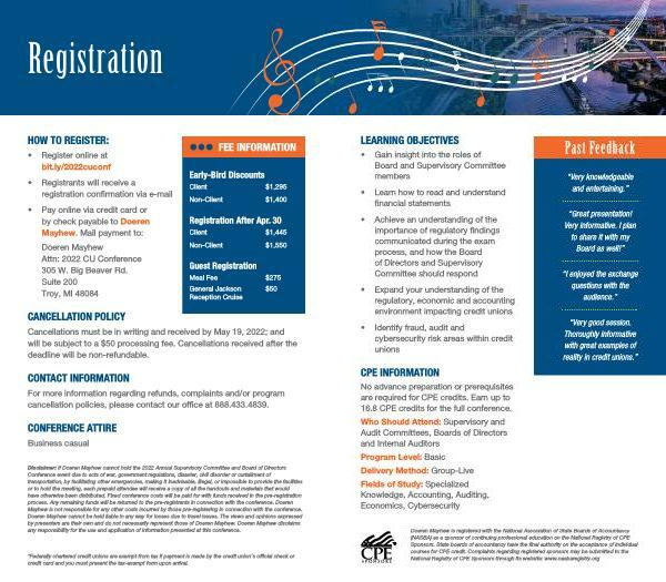 • Pay online via credit card or by check payable to Doeren Mayhew . Mail payment to : Doeren Mayhew Attn : 2022 CU Conference 305 W . Big Beaver Rd . Suite 200 Troy , MI 48084