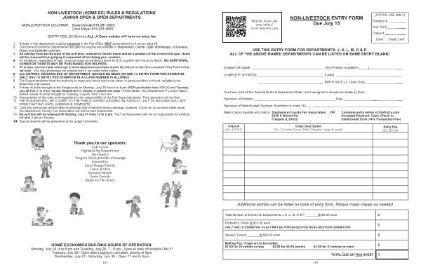 EXHIBITOR TICKETS MAY BE PURCHASED FOR HELPERS . 5 . All entries must be made online ( go to www . stephensoncountyfair . org for the link ) or on the Non-Livestock Entry Form in the fair book . You may photocopy the original form if you need more copies . 6 . ALL ENTRIES , REGARDLESS OF DEPARTMENT , SHOULD BE MADE ON ONE ( 1 ) ENTRY FORM PER EXHIBITOR . 7 . ONLY ONE ( 1 ) ENTRY PER EXHIBITOR IN A CLASS NUMBER IS ALLOWED . 8 . The Superintendents have the authority to reject any article that is not clean , in good condition or found ineligible to be deserving of an award .
