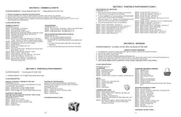 Trucks - limit ten ( 10 ) pieces . Judged by best display M4009 - Jewelry ; Handmade ; one ( 1 ) set up to three ( 3 ) pieces M4010 - Scrapbooking ; minimum of five ( 5 ) pages M4011 - Wine bottle Art M4012 - Wreath - any material , up to 18 " M4013 - Door Swag M4014 - Nut Cup or Party Favor - designed to be used at each place setting - four ( 4 ) M4015 - Mugs or Cream / Sugar Collection - six ( 6 ) M4016 - Coke Collection - limit ten ( 10 ) M4017 - Newer decorated Tin Can Collection - limit six ( 6 ) M4018 - Sports Item Collection - limit ten ( 10 ) M4019 - Coin or Stamp Collection - limit twelve ( 12 ) M4020 - Miscellaneous Collection - limit twelve ( 12 )