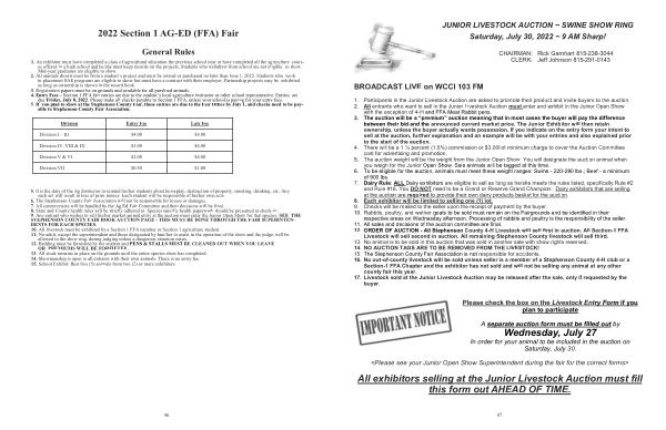 JUNIOR LIVESTOCK AUCTION ~ SWINE SHOW RING Saturday , July 30 , 2022 ~ 9 AM Sharp !